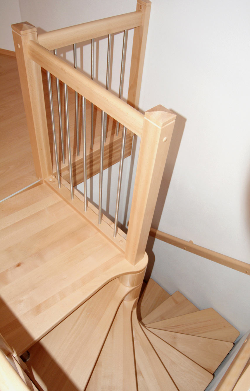Spindeltreppen oder auch Wendeltreppen genannt, eignen sich hervorragend für kleinere Grundrisse, da die spiralförmige Anordnung der Stufen nur wenig Platz erfordert. Spindeltreppen können wir in zwei verschiedenen Konstruktionsarten anbieten - als reine Holztreppe oder mit Stahl kombiniert.